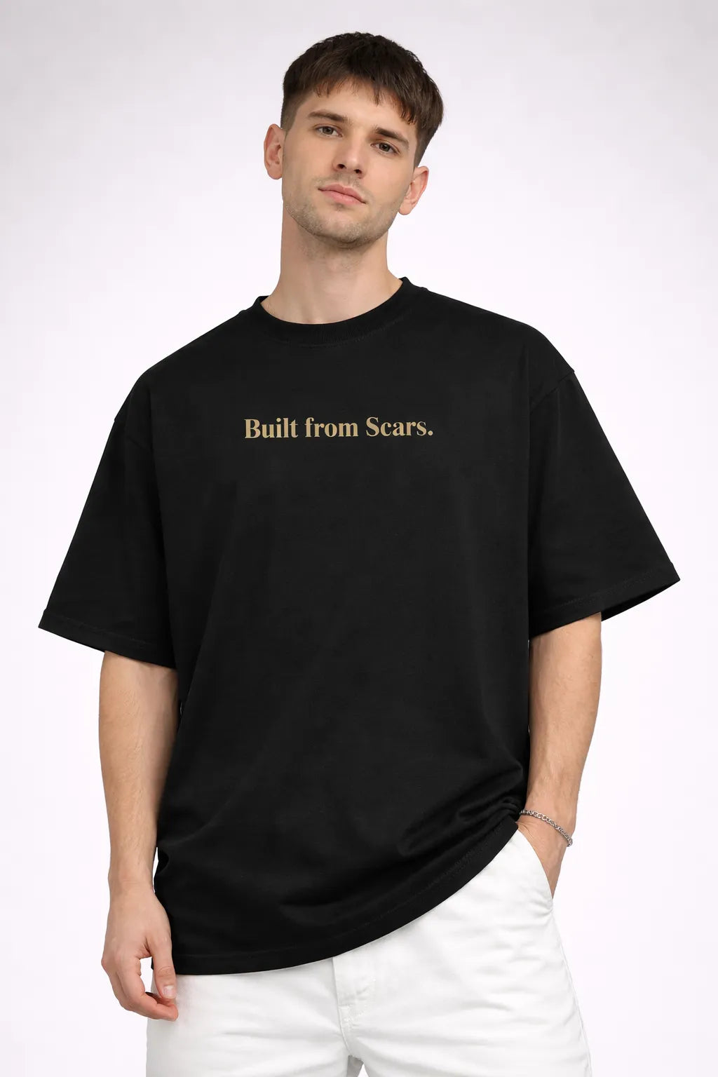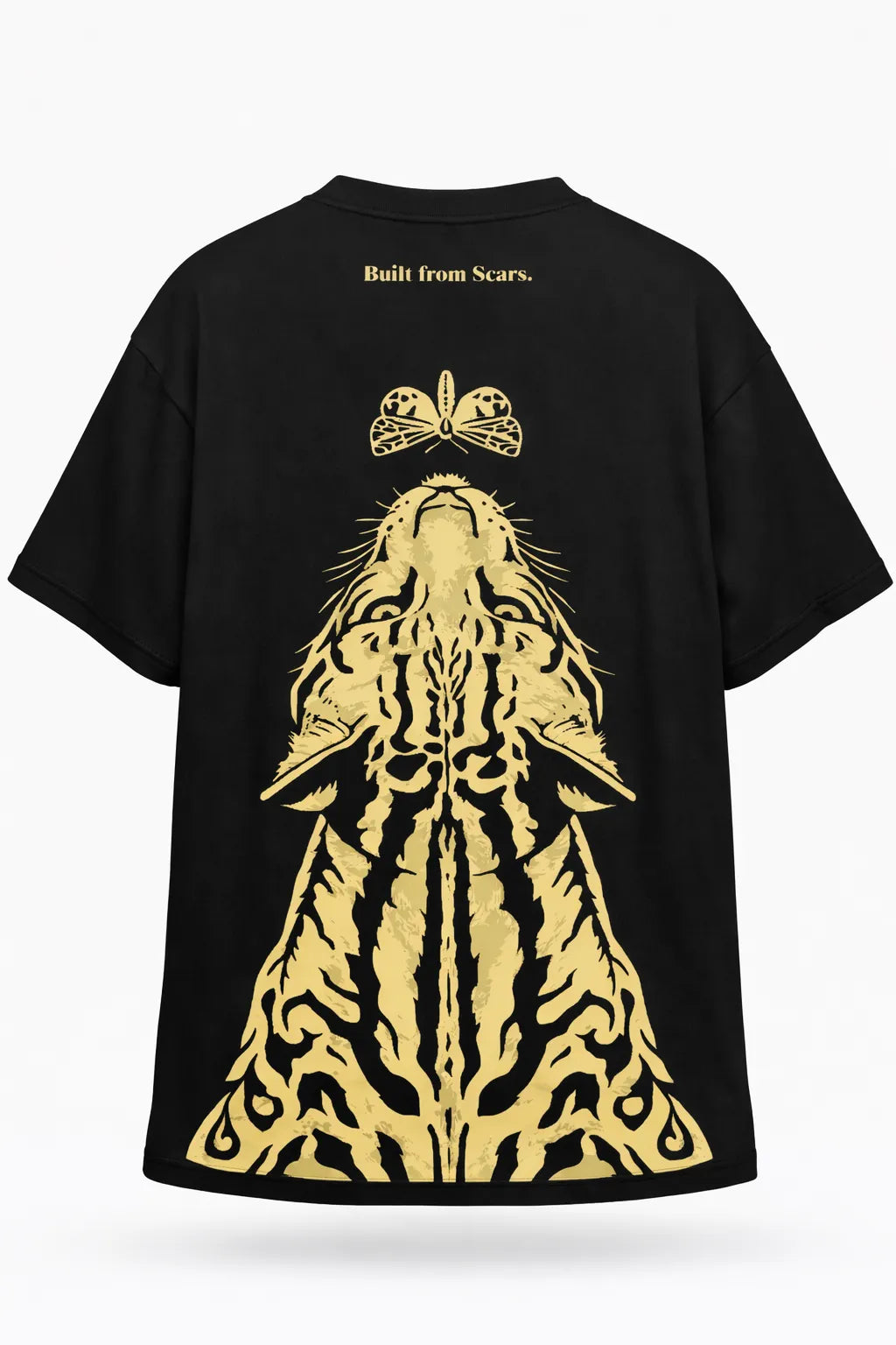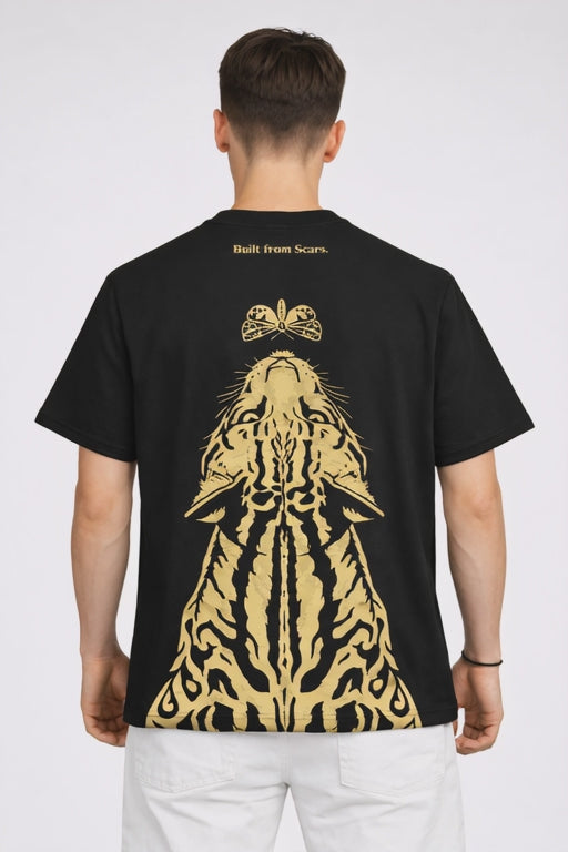 The Built From Scars T-Shirt reflects resilience shaped through experience. Set on a deep black base, the graphic represents growth through struggle and the marks that define identity. Designed with a relaxed streetwear silhouette and crafted from soft breathable cotton, it balances comfort with a powerful conceptual statement.